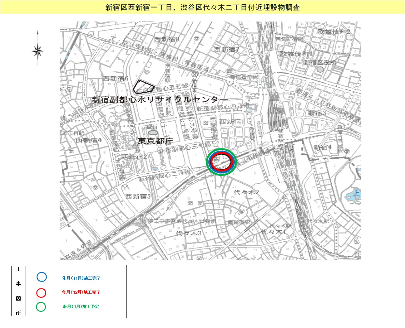 新宿区西新宿一丁目、渋谷区代々木二丁目付近その2埋設物調査 | 7.10~ 8.1 |
