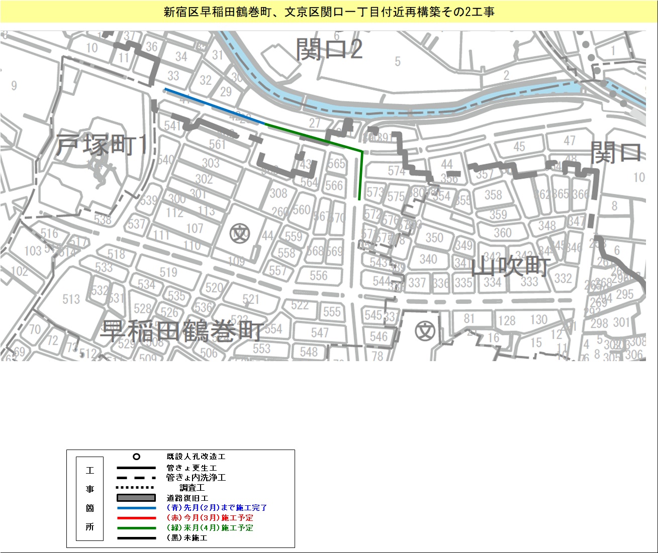 新宿区早稲田鶴巻町、文京区関口一丁目付近再構築その2工事 | 7.9~ 8.6 |