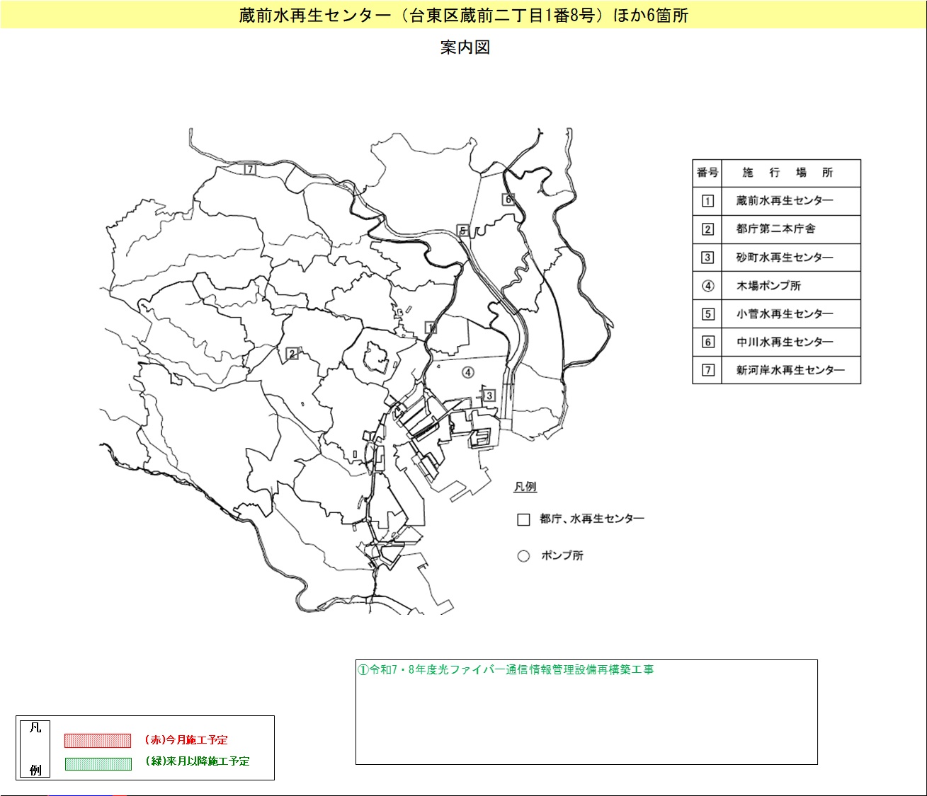 | 台東区 | 台東区蔵前二丁目1番8号(蔵前水再生センター)ほか6箇所 | 令和7・8年度光ファイバー通信情報管理設備再構築工事 | 7.10~ 9.3 |