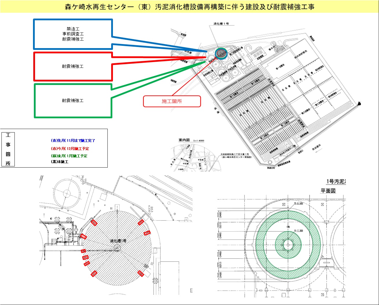 | 大田区 | 大田区昭和島二丁目5番1号(森ヶ崎水再生センター内) | 森ヶ崎水再生センター(東)汚泥消化槽設備再構築に伴う建設及び耐震補強工事 | 7.2~ 8.2 |