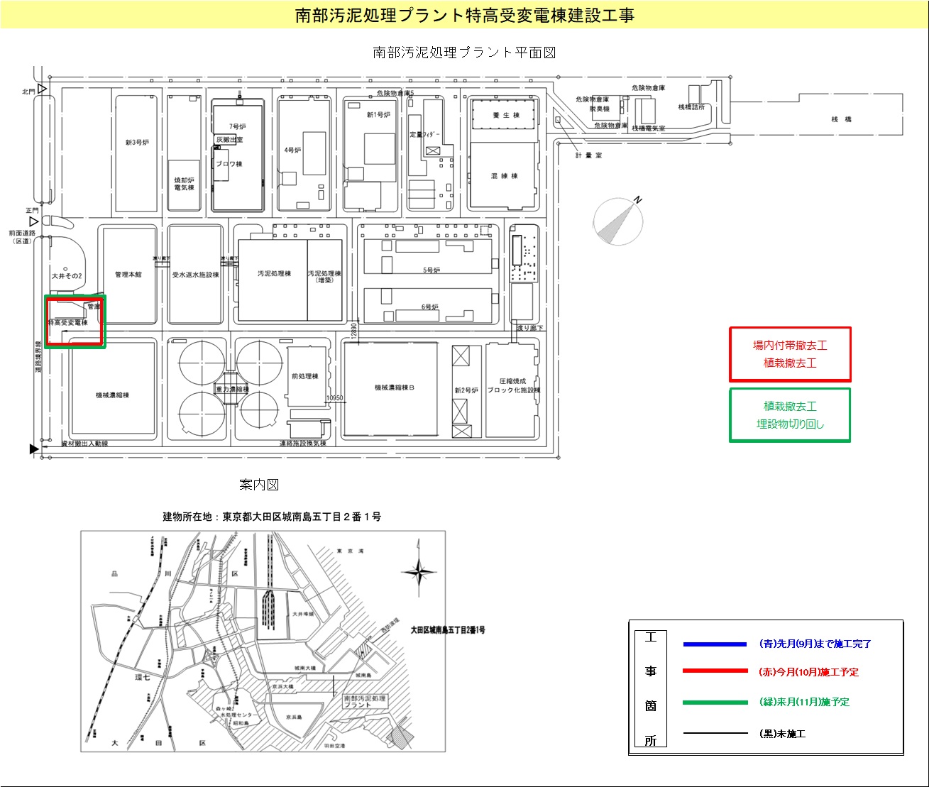 | 大田区 | 大田区城南島五丁目2番1号(南部汚泥処理プラント内) | 南部汚泥処理プラント汚泥処理電気設備再構築その7工事 | 6.4~ 9.3 |
