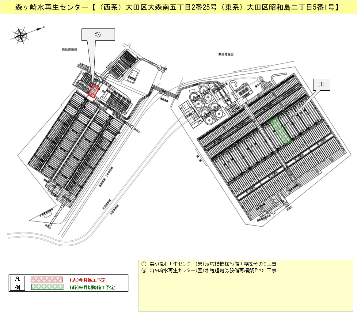 | 大田区 | 大田区昭和島二丁目5番1号(森ヶ崎水再生センター(東)内) | 森ヶ崎水再生センター(東)反応槽機械設備再構築その5工事 | 7.11~ 10.2 |