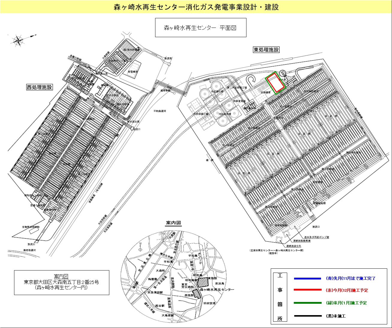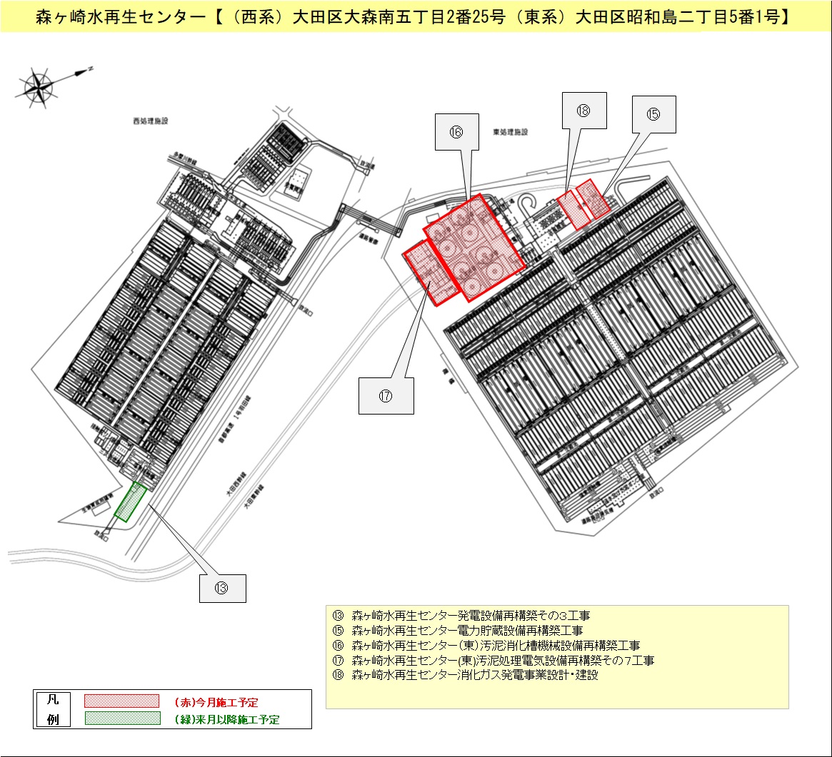 | 大田区 | 大田区大森南五丁目2番25号(森ヶ崎水再生センター(西)内) | 森ヶ崎水再生センター発電設備再構築その3工事 | 4.12~ 9.1 |